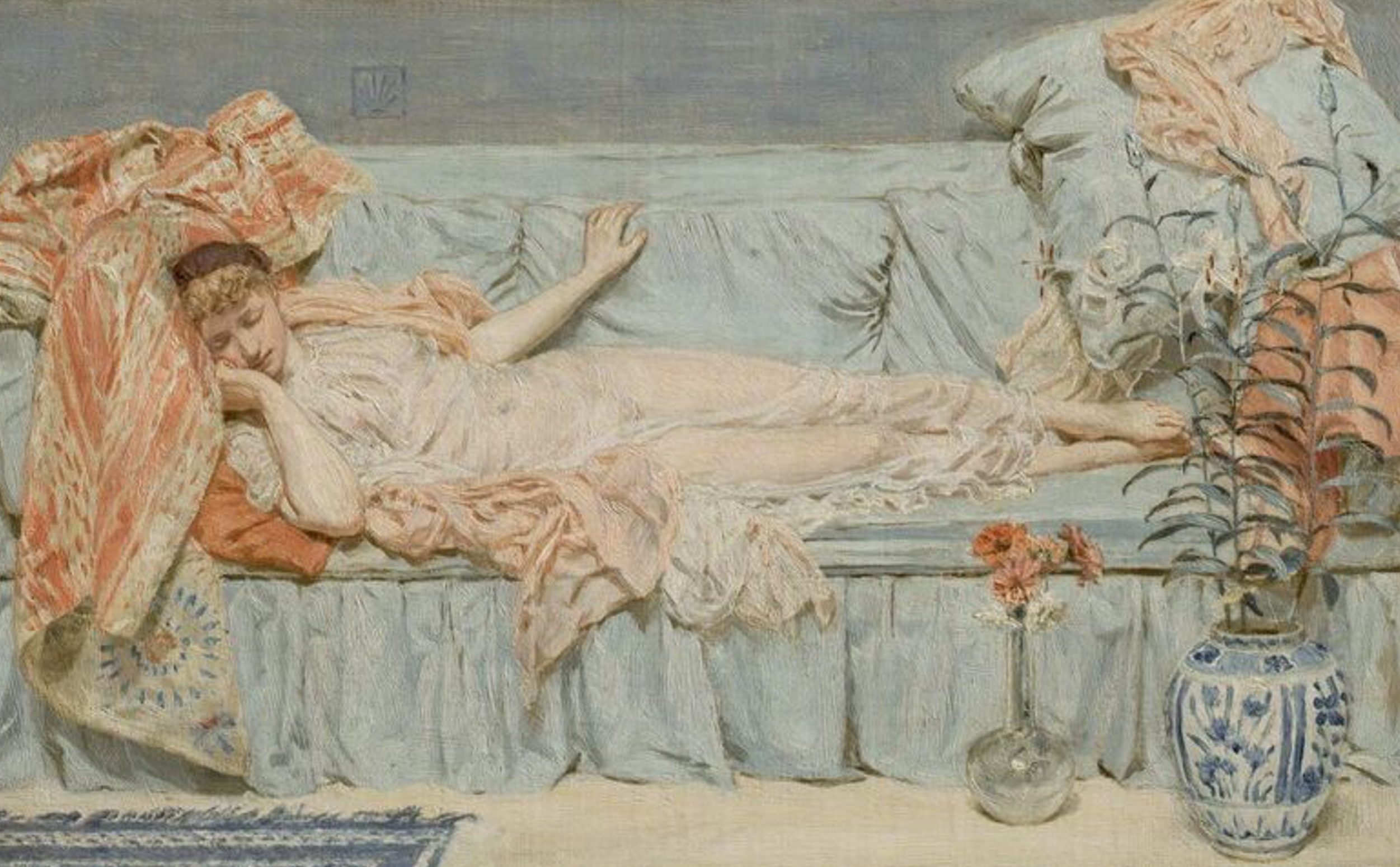 The painting is a blend of traditional aspects seen in Aestheticism, showing beauty without realism, and crafting a scene that highlights ideas of harmony; however, it also emphasizes scientific references to pulsation and sensation, creating a shift in the traditions of Aestheticism that is explored further within Moore’s other paintings. The interplay of diagonals and horizontals gives a sense of the passage of time, elapsing from one moment to another, similar to notes within a musical composition–with sound being a form of external sensory considered in the exploration of beauty. This ties into the idea of cherishing fleeting moments, as well as the weaving and unweaving of ourselves that is found in the Aesthetic Movement and relates to the notion that sleep is “a condition of entire passivity”, [2] where the body is present and sentient, but not in active attention.