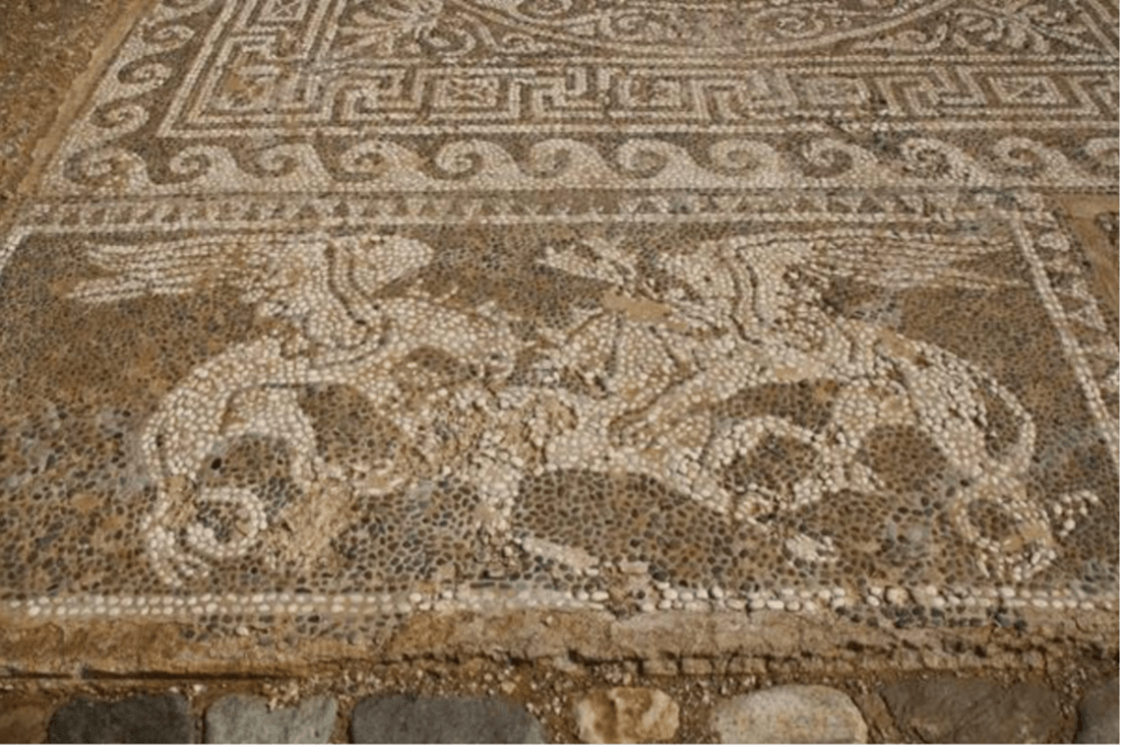 A kylix, or wine cup, used as a drinking vessel at symposiums performed as an agential being when fulfilling a liquid libation, pointing to the concept of “secular objects [being] adapted and sometimes given special forms for religious purposes.”[5] Kylixes were often not stored in the symposium room proper, but rather set away in a different space separate from the andron. An andron was an image saturated space surrounded by visual and material culture that was reserved for men and also often used as symposium spaces. The Gryphon Mosaic (Figure 6), in the andron of House AVI 3 at Olynthos, is an intimate room designed with intention–to curate a climate of both exclusivity and inclusivity. The construction of the space is also a direct response to the long-standing practice of the symposium. As the symposiast enters the andron, they are stepping over the mosaic, with the mosaic itself acting as the boundary between transitioning zones. As a libation vessel was carried from the room it was stored in, past the mosaic, and into the andron, it underwent an initiation process, moving from a “thing” into an active proxy in the symposium program.
