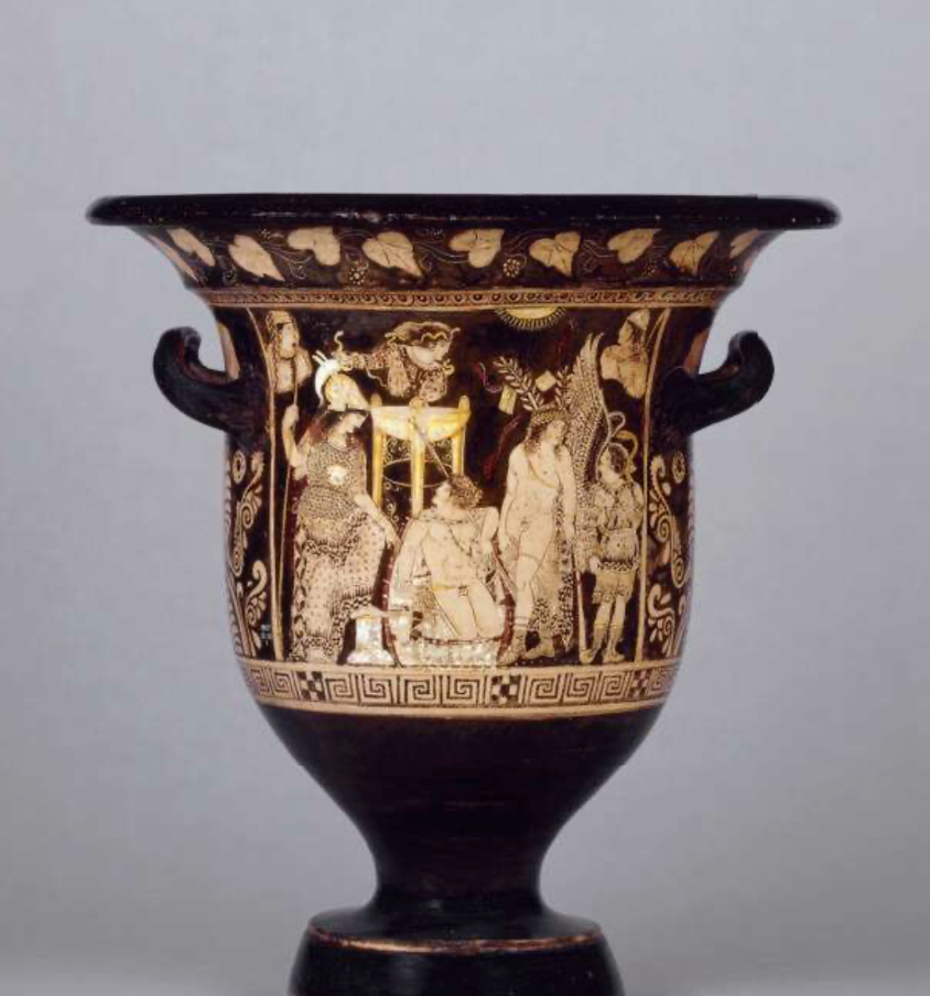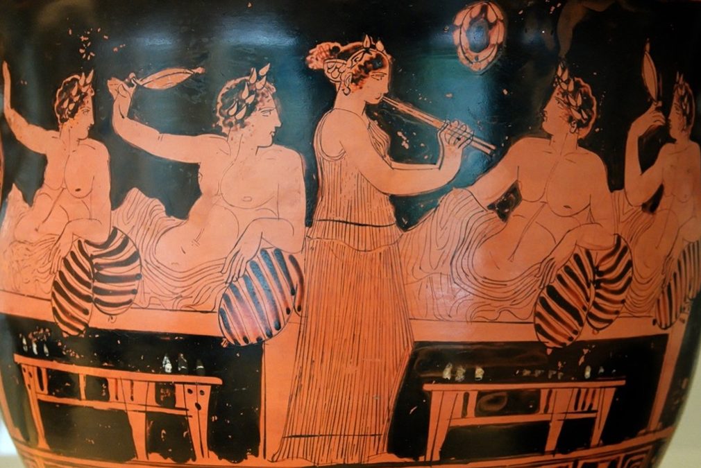 With wine being a central component, the symposiarch–a symposiast designated by the host to lead the symposium program–strategically regulated the wine–to–water mixture. The position of liquid libations is significant not only in symposium behavior and conversation, but also in symposium pottery vessels, as exemplified in a ca. 420 BCE Attic (Athenian) red-figure bell-krater depicting a symposium(Figure 5). The krater, a vessel used for mixing water and wine, illustrates a figural scene of a hetaira playing an aulos, or a flute, entertaining a group of reclining symposiasts engaged in a game of kottabos, each holding a skyphos above their heads and throwing wine grape remains while aiming at a target. This meta-depiction of an image of a symposium on a vessel used during symposiums demonstrates just how encoded the culture of symposia was in Athenian culture––even within the architecture of home.