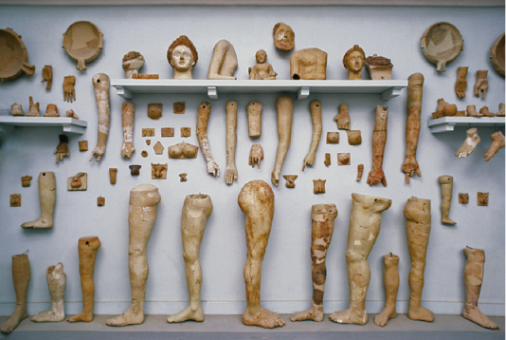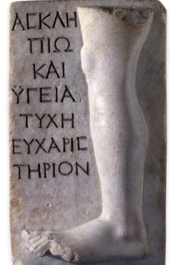 Anatomical votive offerings were often found in burial and ritual deposits, representing a Greek market for figural substitution (Figure 3). These votives were often produced in terracotta and took forms embodying an array of body parts representing physical difficulties and ailments, with parts ranging from arms, legs, and eyes, to breasts, reproductive organs, and genitalia. Once purchased, the body parts were then sacrificed to Asclepius, the god of healing. Some offerings were accompanied by contextual inscriptions detailing the specific recipient of the gift, speaking to the way that these anatomical votives were thought to embody the intentions and prayers of the individual making the offering (Figure 4). Many anatomical votives have suspension holes, allowing the temple priest to hang and display them, pointing to the important role that community played in facilitating offerings. This public display also underscores the complex interplay between private devotion and the communal practice of offering. Anatomical votives are particularly interesting because they have a degree of intimacy and sociality. Further, many of these offerings have unique variations that reference the individual wanting to be embodied in the figural pieces they are gifting to the gods. This communicates the deeply personal nature of a votive offering in the Greek rhetoric–forming a human-thing connection that considers object offerings to be an extension of human autonomy. These object offerings move past their “thingness” because they are anchored and stable in their being, a stability produced and maintained through their entanglements within an assemblage of human-thing relationships and dependencies that make up the larger Greek system of interaction.[4]