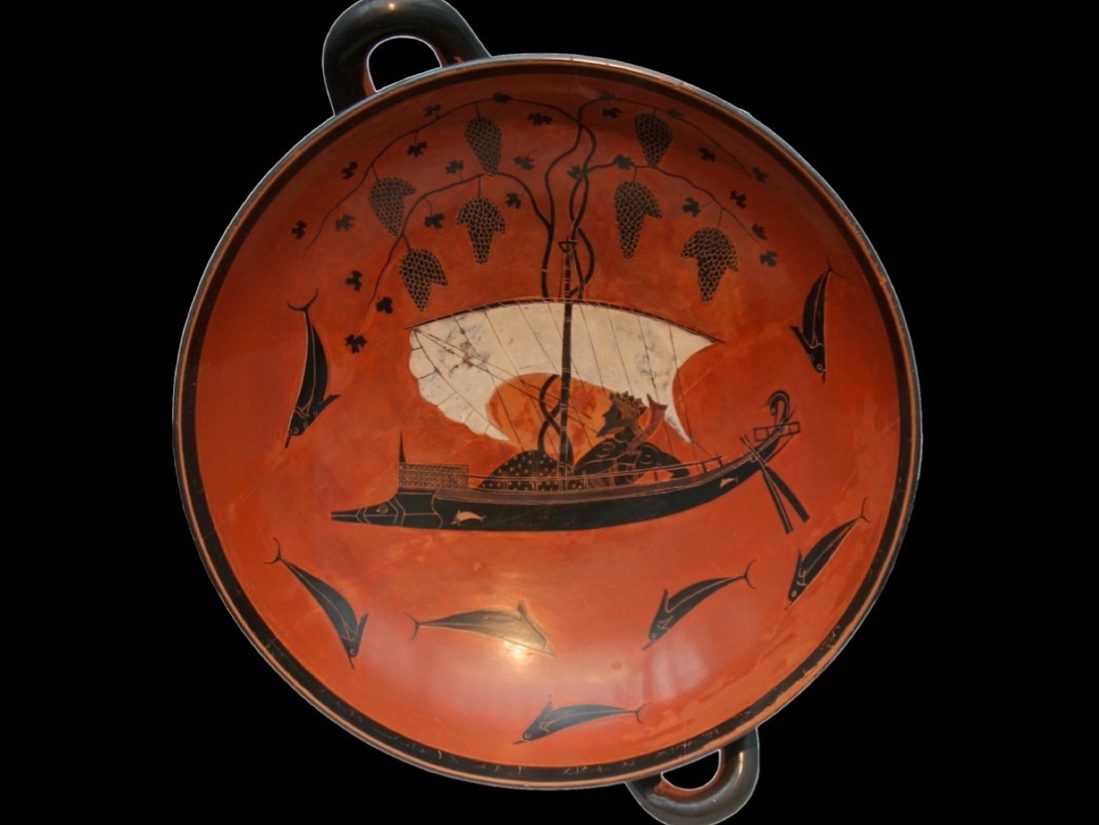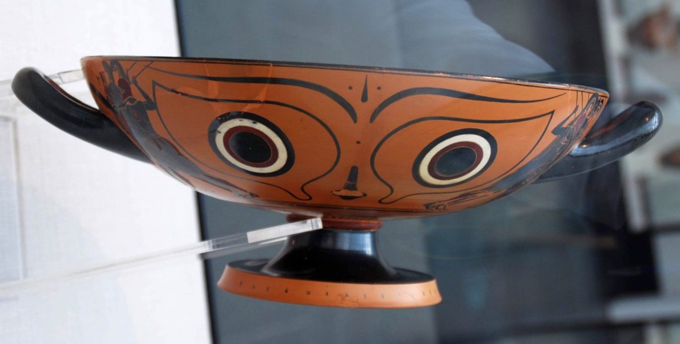 Dionysus, the god of wine, was often honored and celebrated at symposiums, with ceremonious vessels referencing the god and symposiasts offering prayers, singing hymns, and performing honor rituals in his favor. The Vulci black-figure kylixdepicting Dionysus sailing the sea (Figure 7), ca. 540-530 BCE by Exekias, uses heavy visual symbolism driving conversation and comedic ornamentation encouraging interaction from the user, both actively immersing the cup within the symposium program. Overgrown vines and clusters of grapes draped atop the ship’s mast, wine-dark waters concealing the mysteries of the underworld and playing on the idea that water turned to wine, wind blowing into the middle of the sail moving the ship as the symposium moves along. Here, Exekias is offering a prompt to the user of the cup in a symposium setting, one about transforming from one form to another. Much like the seven dolphins painted on the cup, referencing the fate of the Tyrrhenian pirates in the 7th century Homeric hymn to Dionysus, those drinking from the kylix (often referred to as the Dionysus Cup) are magically transformed. This is because, painted on the exterior of the vessel is a large pair of zoomorphic caricature eyes, with the handles acting as ears and the vessel stem a snout, transforming the drinker into a mythic creature appearing as if they are putting on a bestial mask as the vessel covers their face (Figure 8). Designed to be interactive and playful, the “eye cup” effect is only one of the transformations the user undergoes, the other being an alcohol-induced metamorphosis. By using the cup in libations, participants may have sought to establish a connection with Dionysus, invoking his presence and blessings. The Dionysus Cup serves as a tangible link between the Ancient Greek practice of libations and the worship of Dionysus, highlighting the significance of wine and ritual in honoring the god.