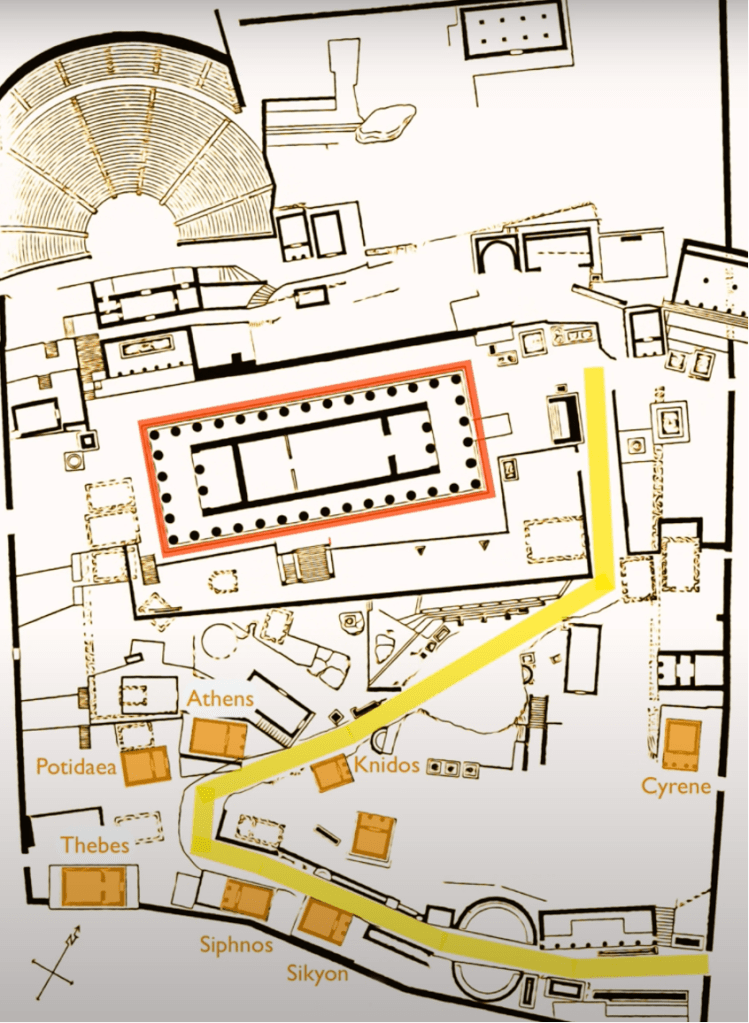 Although the site was a spot for all Greeks to come bearing gifts to offer and question to propose to the oracle, it was also a space where wealth, power, and influence was expressed. The offerings brought as devotional gifts to Delphi functioned as “token[s] of exchange,” used as leverage not only to assert wealth and status, but as cogs in a valuation system, with certain devotions gaining privileged access to certain gods.[11] This system of interaction occurring on the site between offerings, offerees, gods, and sacred spaces was reflected in the architectural plan of the sanctuary’s built environment, which was designed to mediate how people navigated the boundaries of space and the actions allowed within a space (Figure 11).
